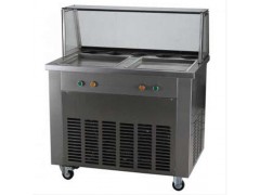 炒冰机其实就是炒酸奶机,是把水制品属于冷冻的方式,是液体变成半固体。炒冰机由压缩机、冷凝器、蒸发器、毛细管、过滤器组成,其特征是压缩机的一端与冷凝器进口端相接,另一端与蒸发器的出口端相接,冷凝器的出口端与过滤器的进口端相接,蒸发器的进口端与毛细管出口端相接,过滤器的出口端与毛细管进口端相接,蒸发器由盘管和炒锅组成,盘管是绕缠在炒锅的锅底上,在冷凝器的一侧装有强制冷凝器冷却的风机。炒冰机可以用来做炒冰、炒冰果、炒雪花膏等产品。可以做炒酸奶,冰激凌卷,可以炒鲜果酱或者果汁,都是非常美味的。炒冰的程度可以随意控制,真的是老少皆宜。